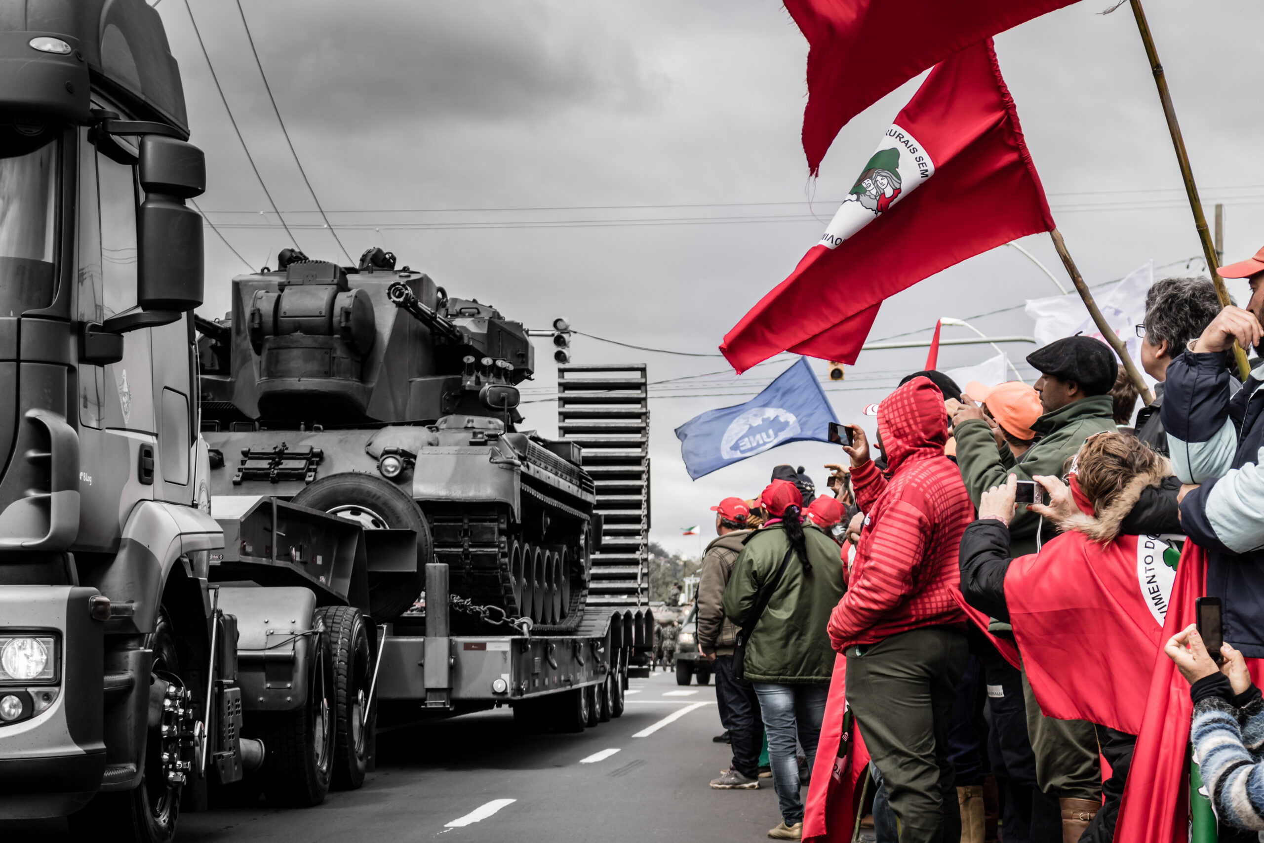 Mesmo com a ameaça de um confronto desigual contra os militares, os manifestantes permaneceram concentrados a poucos metros do desfile, entoando gritos e cantos de protesto. A foto que abre este artigo, inclusive, mostra o momento exato em que os veículos blindados passam ao lado dos militantes dos movimentos sociais.